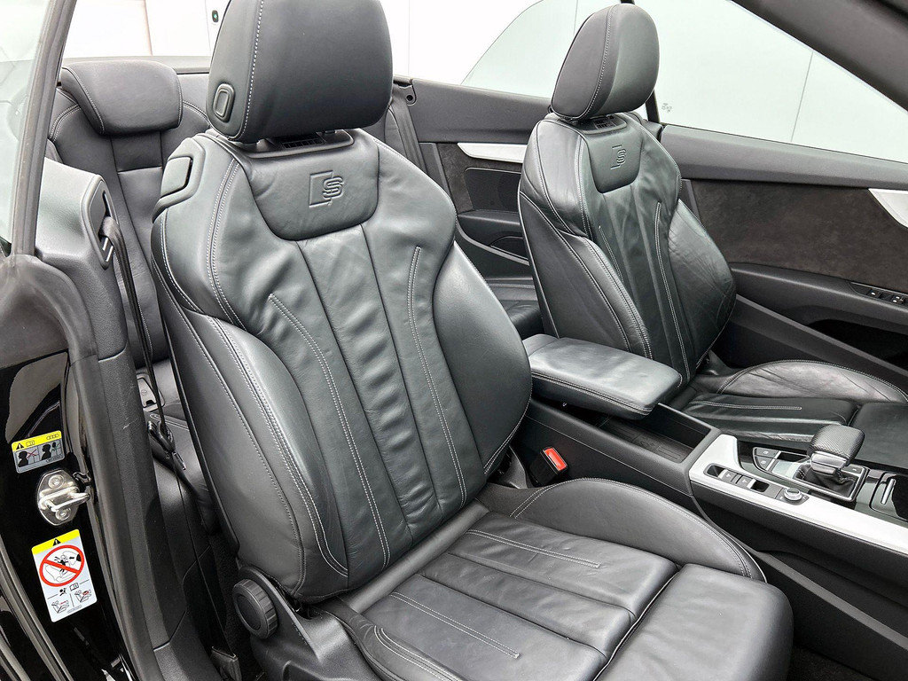 Zijn dynamische uiterlijk maakt al direct duidelijk wat voor rijervaring u van deze Audi A5 Cabriolet mag verwachten: pure sportiviteit. Hij heeft een benzinemotor en een automatische transmissie. Het lederen interieur ademt luxe, en het zit uiteraard fantastisch. Een weldaad voor uw rug en die van uw bijrijder: deze Audi A5 Cabriolet heeft verwarmbare voorstoelen met massagefunctie. Chauffeur en bijrijder zitten stabiel in de scherpe bochten door de sportstoelen. Met het elektrisch bedienbare dak verandert u deze cabrio in luttele seconden in een auto voor zonaanbidders. Met matrix LED-verlichting rijdt u eigenlijk altijd met groot licht, dus maximaal zicht. Toch is verblinden er niet bij, want het systeem regelt de verlichting zo dat tegenliggers er geen last van hebben. Ook 19 inch lichtmetalen velgen, sportonderstel, warmtewerend glas, LED-achterlichten, verstelbare lendensteunen en windscherm horen tot de voorzieningen op deze auto.